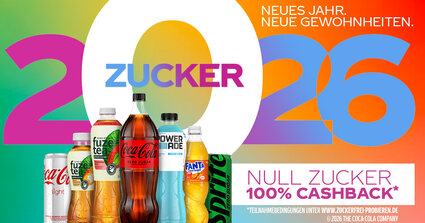 Bis zum 08.02.2026 erhsalten die ersten 2.000 Teilnehmer/-innen täglich ab 9 Uhr einmal den Kaufpreis für eine Einzelflasche/-dose zurück. Pro Person ist maximal eine Einlösung für 2 Sorten möglich. Teilnehmende Aktionspackungen soweit im Shop verfügbar: 0,33L EINWEG Dose, 0,4L, 0,5L, 0,85L, 1,25L und 1,5L PET EINWEG Flasche der Marken Coca-Cola light, Coca-Cola Zero Sugar, Coca-Cola Zero Sugar koffeinfrei, Fanta zero Orange, Fanta zero Lemon, Fanta zero Mango, Fanta zero Mandarine, Fanta zero Exotic, Fanta zero Pink Grapefruit, Sprite zero, mezzo mix zero, Powerade Zero, Powerade Active Water und Fuze Tea ohne Zucker. Teilnahmebedingungen einsehbar unter www.zuckerfrei-probieren.de